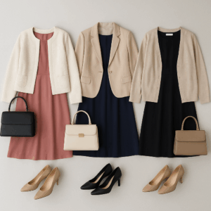 ワンピース✖️ジャケットなども自宅のもので組み合わせやすいかと思います。